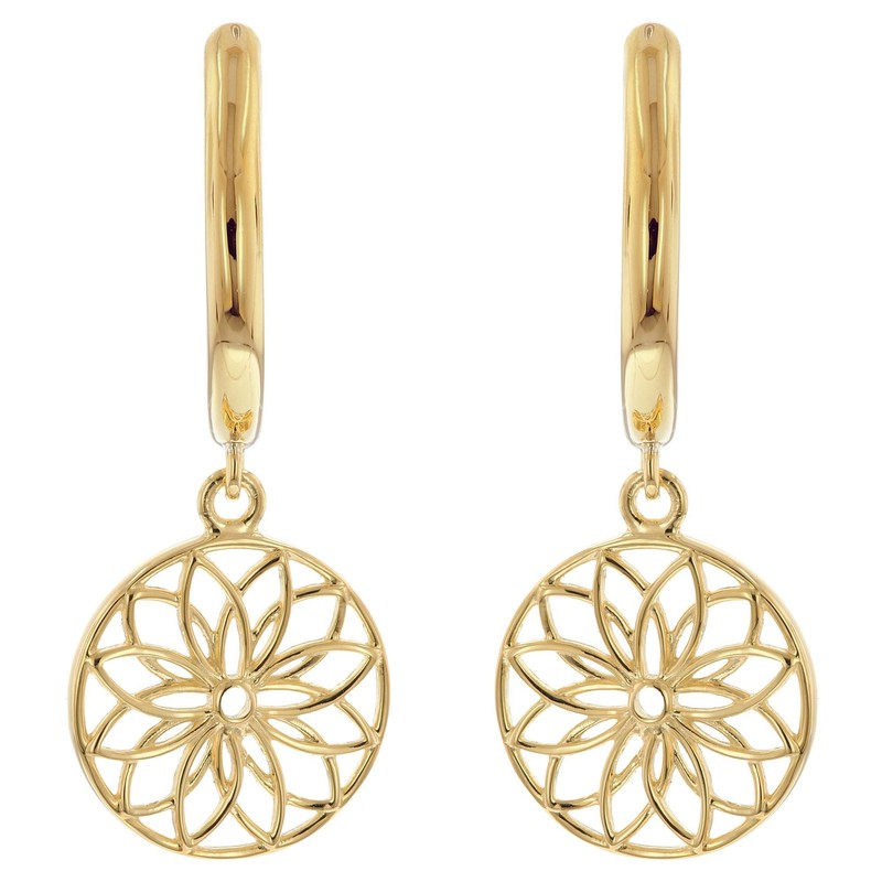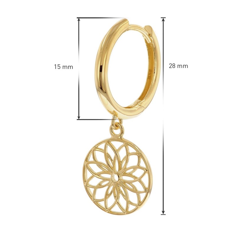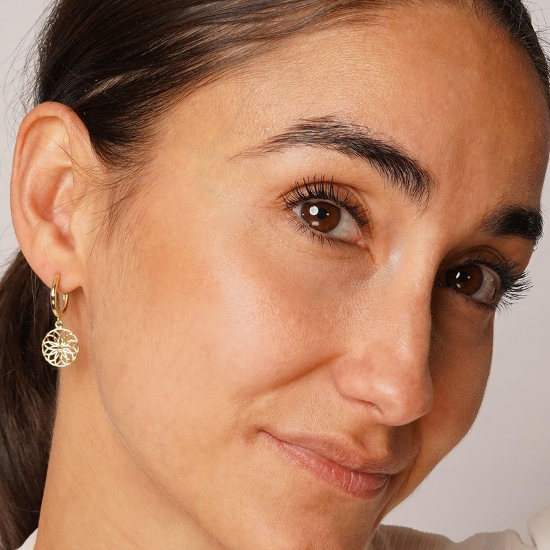 - Symbolic Elegance — Gold-plated 925 sterling silver forms the basis of these folding hoop earrings, crowned by a filigree flower of life pendant that embodies wisdom and harmony.