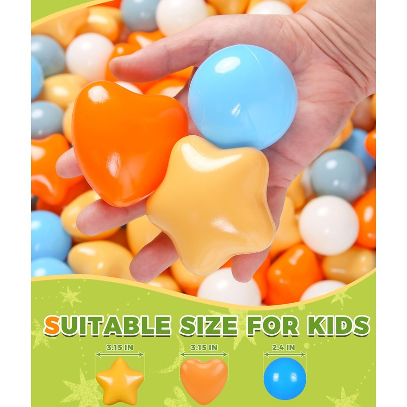 - BABY-SAFE MATERIAL: Crafted from lead-free and non-toxic materials, our plastic balls are safe for babies and toddlers to play with. The smooth edges and soft texture ensure a comfortable grip, while the non-toxic material guarantees a safe play experience. Size: Star 3.15 in, Heart 3.15 in, Round 2.4 in.
