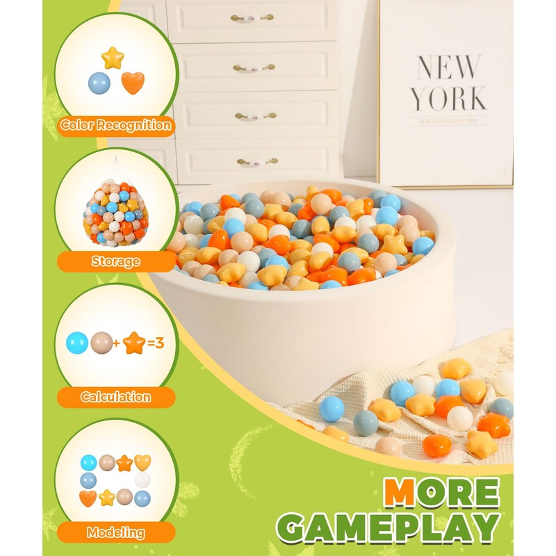 - BIGGER VARIED SHAPES FOR ENDLESS FUN: Our shaped balls comes in a mix of three shapes - stars, hearts, and round . This variety adds a whole new dimension to playtime, captivating little ones with different shapes to explore and enjoy. Color: Orange+ Blue+ Cream Yellow.