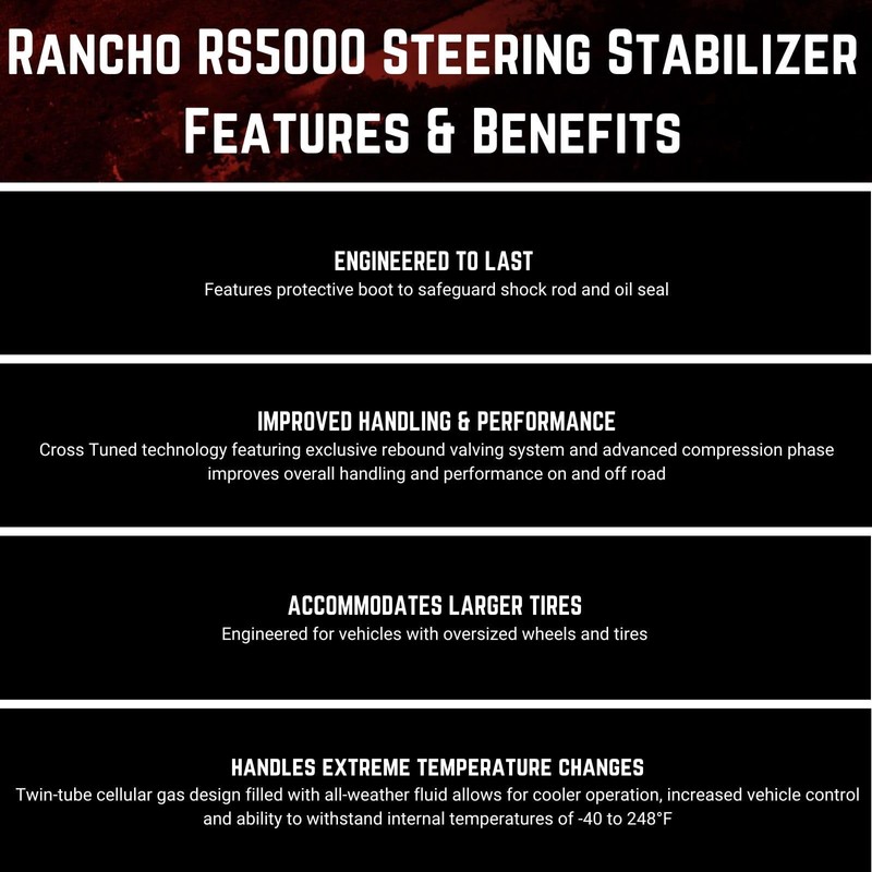 - Engineered to Last: Engineered for vehicles with oversized wheels and tires; Rancho's RS5000 series steering stabilizer features a protective boot to safeguard shock rod and oil seal