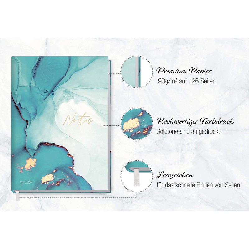- Practical paperback format: DIN A5 (21 x 15 x 1 cm), Ruling: lined, Colour: green/turquoise/emerald, gold, white, Pages: 126.