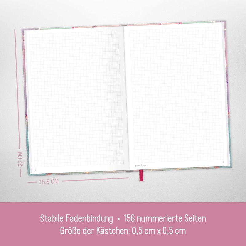 - Squared notebook: slightly larger than A5 (21.8 x 15.5 cm), with practical elastic band for closing and ribbon page marker for marking pages. Book for notes of all kinds, goals, sketches, agenda, plans and thoughts