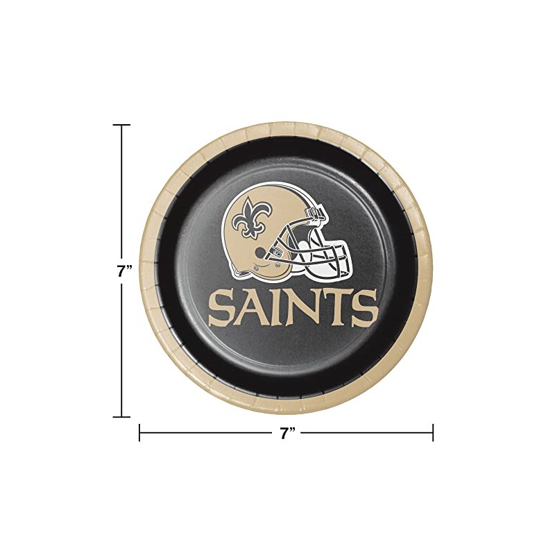 Watch the crowd go wild when you set the table with the New Orleans Saints Dessert Plates. These action packed cake plates measure 7" round and feature the team's logo and helmet with a catchy "New Orleans Saints" caption below. This durable paper plate is sold in packages of 24 and perfect for passing out delicious snacks and desserts during game day parties or tailgate get-togethers.