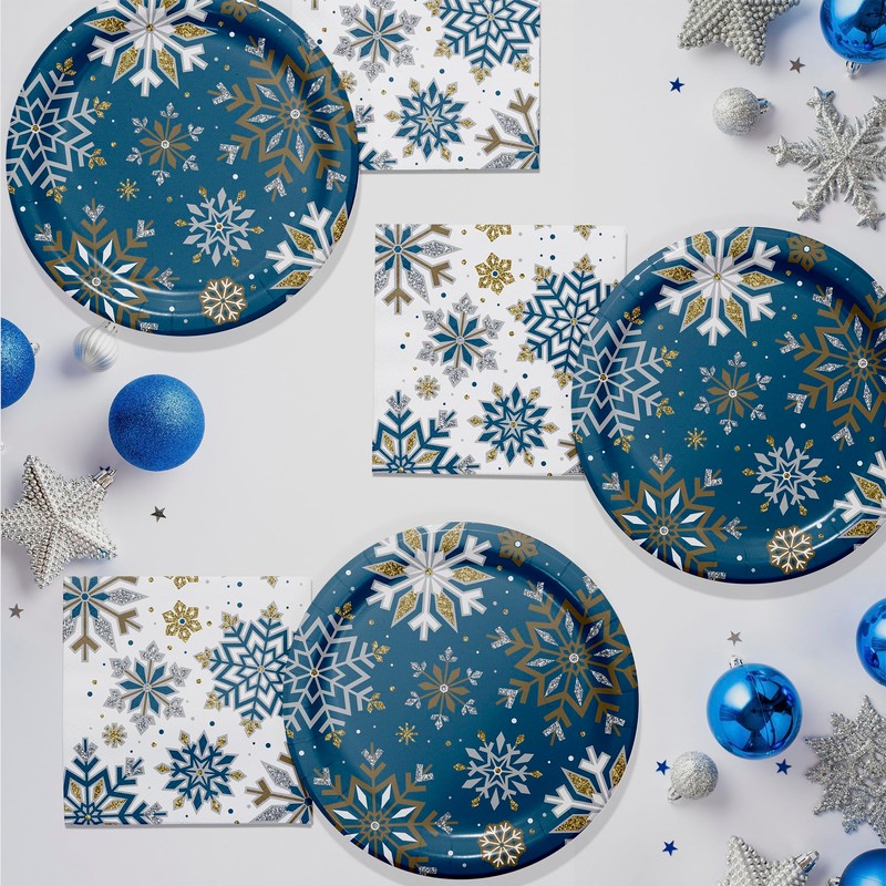 Trendware Whimsical Winter Christmas Dinner Paper Plates and Napkins Set, Serves 16, Snowflake 9" Plates & 6.5" Napkins, Christmas Party Decorations, Heavy Duty Disposable Plates Napkins for Christmas