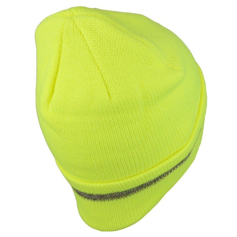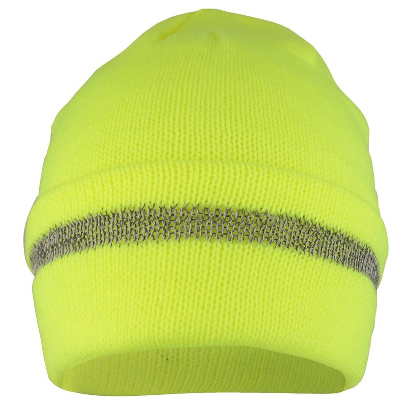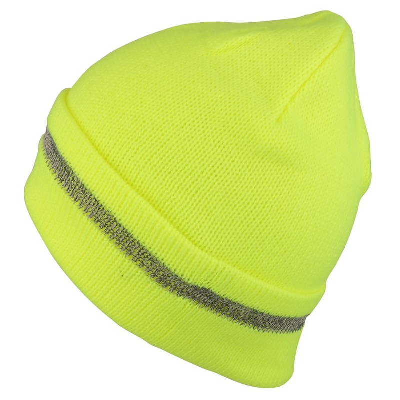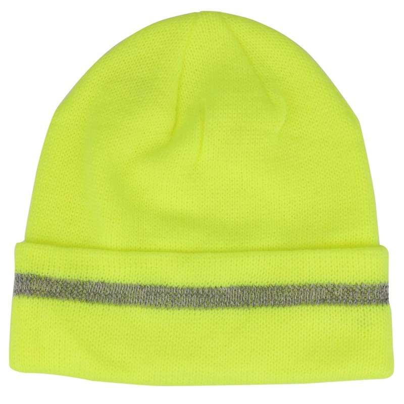 - Plain solid flourescent color beanie with a knit reflective stripe