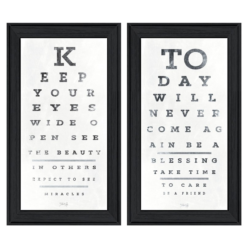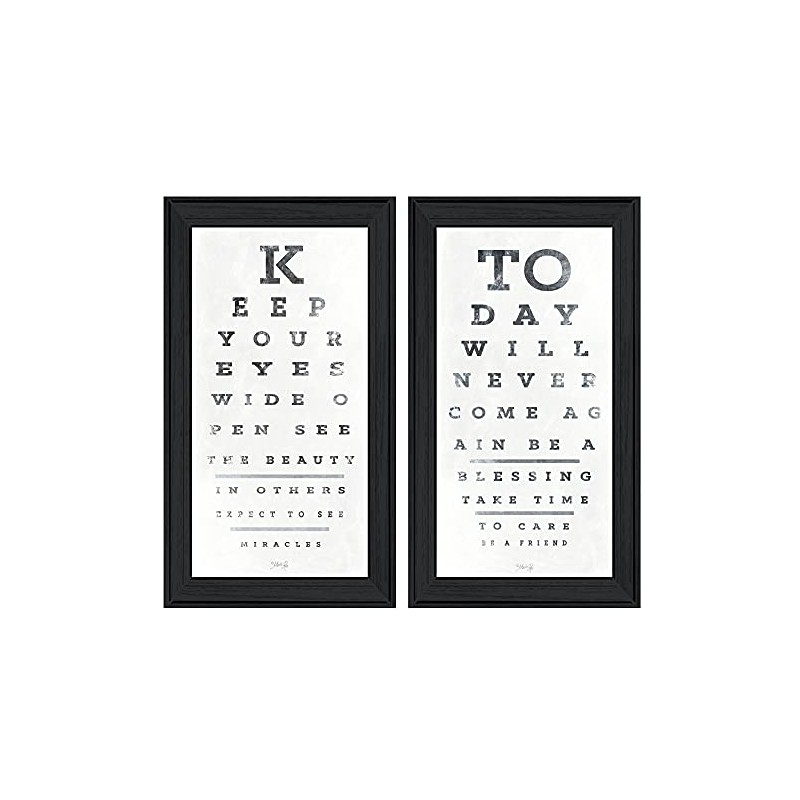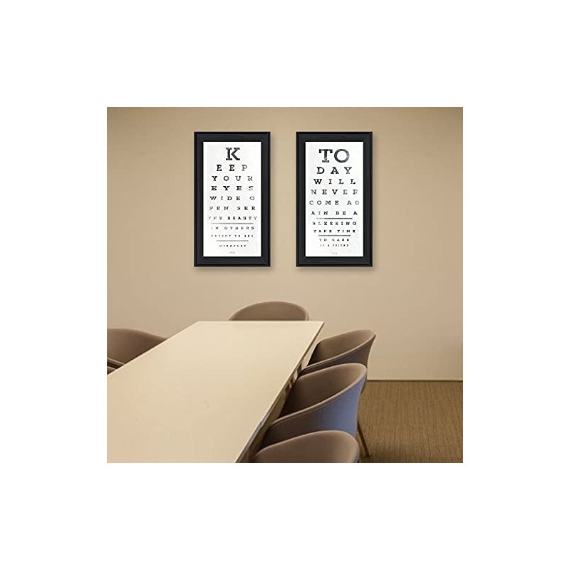 V605-405 "Eye Charts" by artisan Marla Rae. This black framed vignette of 2-(15x27) eye charts gives a special message with them: One eye chart says" Keep Your Eyes Wide Open See The Beauty In Others Expect To See Miracles". The other eye chart says "Today Will Never come Again Be A Blessing Take Time To Care Be A Friend". Perfect messages in an interesting way...by testing your eye sight. The surface of the print is textured with a fade resistant coating so no glass is necessary. Arrives ready to hang. Made in the USA by skilled American workers.FeaturesCollection: Marla Rae Color: BlackMaterial: wood, paperProduct Size: 15 x 1 x 27Assembly Required: NoMade In USA