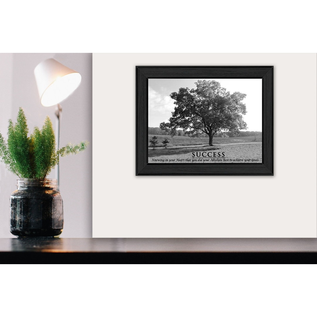 Product Description: This motivational message framed canvas about 'Success' is a 16-inch long x 12-inch print. It depicts a full grown tree in the middle of a clearing with the message 'Success is knowing in your heart that you did your absolute best to achieve your goals.' It is black and white with dark frame. This contemporary art piece is a perfect alternative home decor accent for any home.