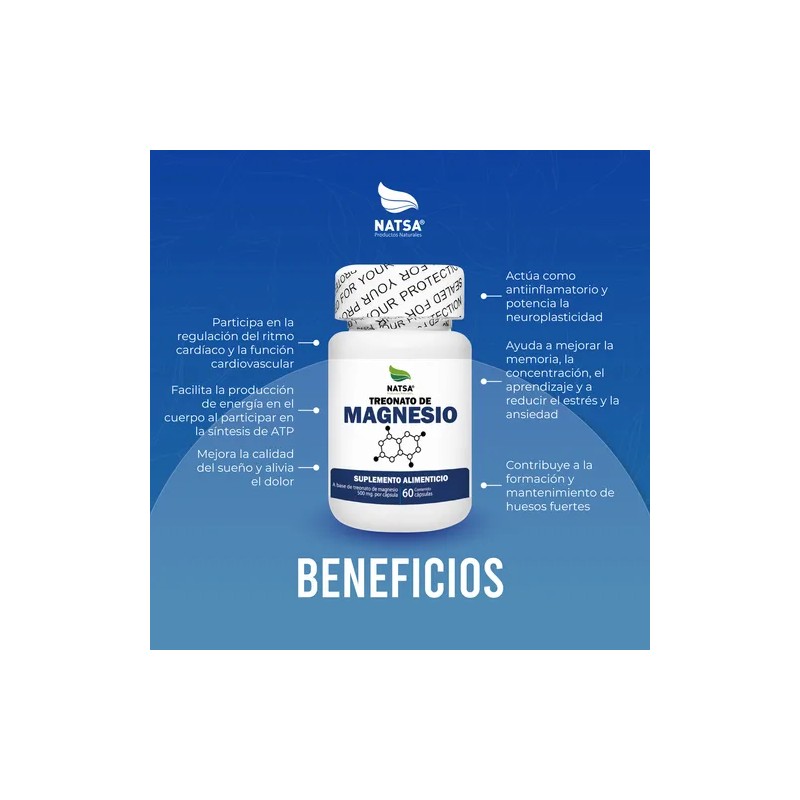 ¡Mejora tu bienestar mental y físico! 🧠💪 El Treonato de Magnesio de Natsa ofrece 500 mg por cápsula, formulado para apoyar la función cognitiva, mejorar la memoria y promover la relajación. Libre de gluten y de alta pureza, es ideal para quienes buscan un suplemento de calidad premium para su salud diaria.