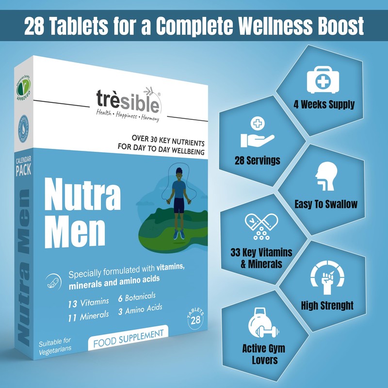 Tresible Trsible Men's Multivitamins and Minerals | Nutra Men 28 Tablets | 33 Essential Nutrients | Primrose Extract and Ginkgo Biloba | Vegetarian, Gluten Free, Halal | No Synthetic Binders or Coating