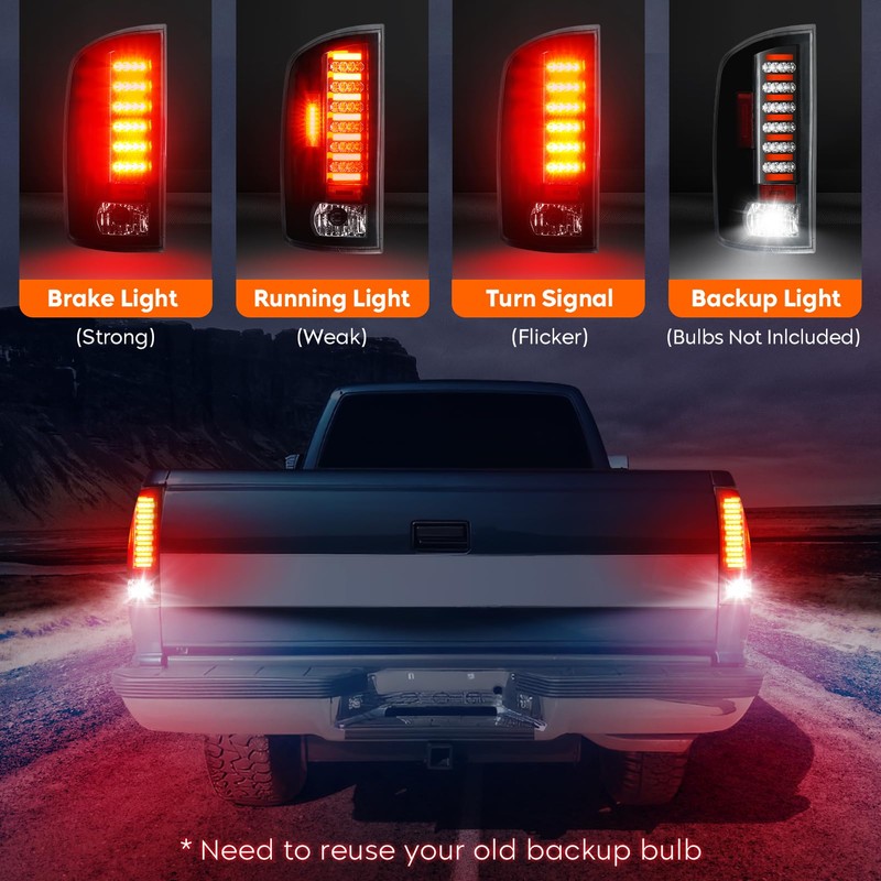All-in-one Taillight: LED running light, brake light, turn signal light, reverse light (backup light) 🔺(you need to reuse your old backup bulb)
