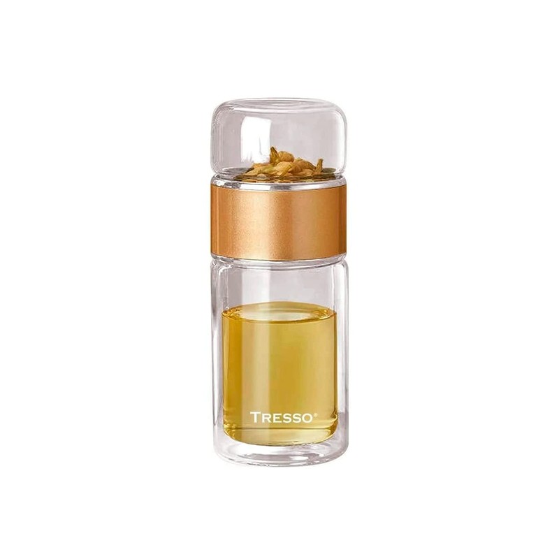 - Botella de vidrio de doble pared con infusor para té de acero inoxidable.