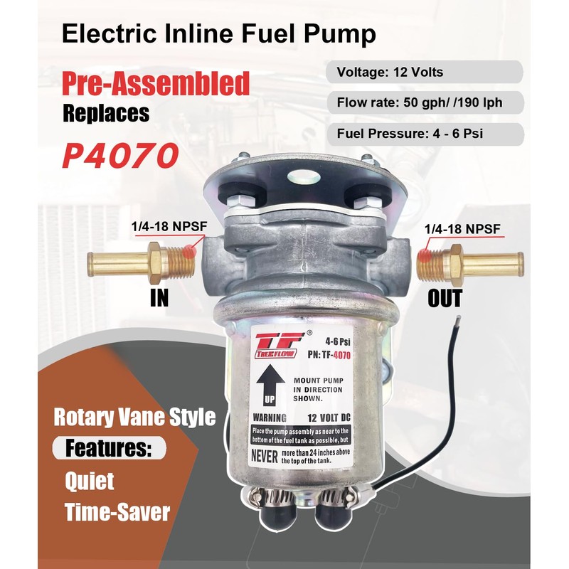 • [Quiet] The TF P4070 Rotary Vane fuel pump is quieter than most of the Mechanical fuel pumps; Pump flows constantly without Interval pulse.