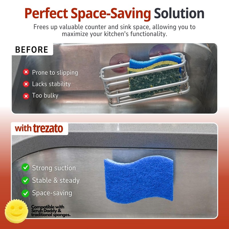 - MAXIMIZE SINK SPACE: The trezato sponge holders compact design efficiently uses sink real estate, allowing for ample room for dishwashing and food prep without sacrificing valuable space.