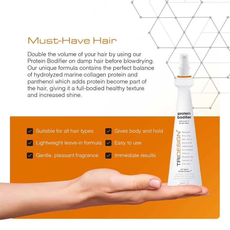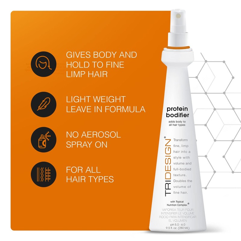 - POWERFUL PROTEIN BODIFIER: Tri Design Protein Bodifier 9.5 oz is the ultimate solution for limp, lifeless hair. Say goodbye to aerosol spray volumizers and welcome our game-changing protein bodifier that adds incredible body and hold to your tresses.