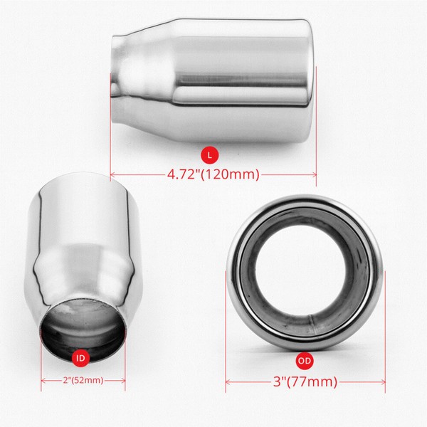 Dimensions of Polished 304 Stainless Steel 2 inch Inlet Exhaust Tip 3 inch Out Rolled 4.72 inch L Weld On