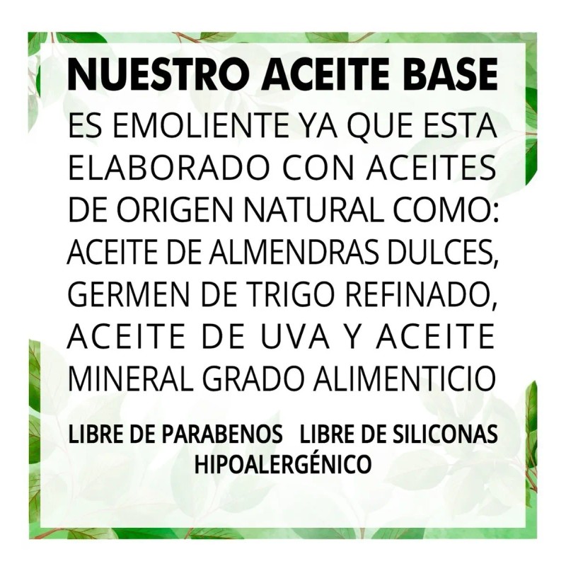 Cada presentación incluye tres variedades de aceites (según disponibilidad o elección): caléndula, lavanda, almendras, coco, eucalipto, menta, entre otros, todos con propiedades hidratantes, relajantes y nutritivas.