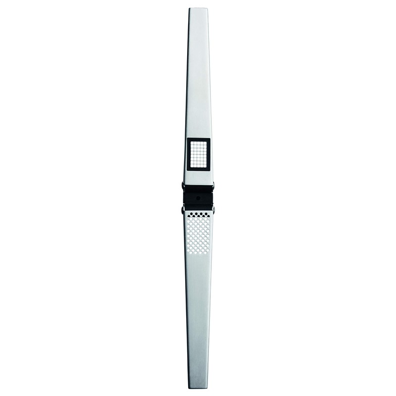 The Duo combines garlic press and garlic cutter in one tool. A classic garlic press on one side, a thoughtful garlic cutter on the other. On the cutting side, the garlic clove is pressed through a sharp grid of 3 x 3 mm, creating fine pins. If you drive along the cutting grid with a knife during pressing, any fine or coarse cubes are created. The Duo can be fully opened for cleaning. A scraper grid cleans the press stamps of garlic residues and ensures quick cleanliness. Made of high quality stainless steel and durable plastic, with sharp special blades. Patented technology. The scraper grille is available as a spare part.