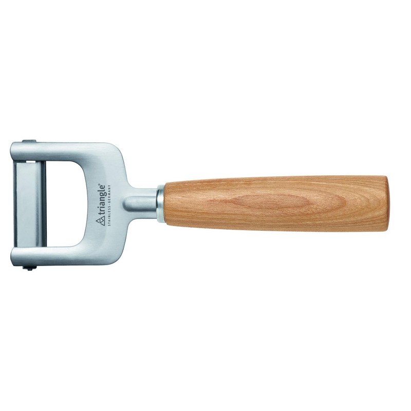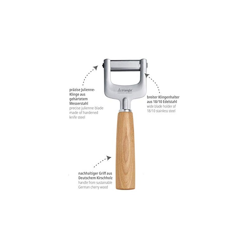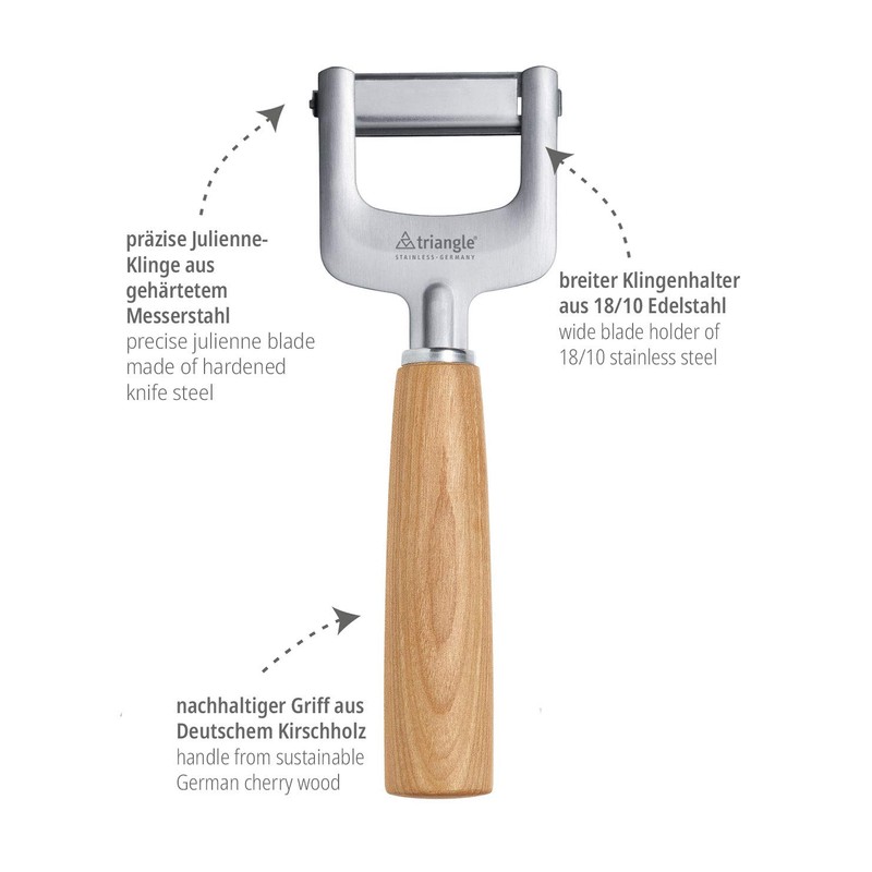 Even vegetable strips for creative kitchen. With the julienne cutter, carrots, courgettes, radishes, beetroot and other types of vegetables are cut into evenly fine, 3 mm thin strips. The julienne cutter is easily used as a peeler and helps in the production of vegetable spaghetti, garnishes, vegetable esters or soup liners. There are no limits to creativity. The high-quality hardened, extremely sharp blade can handle even hard vegetables easily and stays sharp for a long time. Even larger quantities cut completely fatigue-free. For Mood, triangle uses cherry wood from regional fruit meadows and thus supports sustainable wood management and short transport routes. The handles are turned in Sauerland, then finely processed in Solingen and assembled with functional parts made of stainless steel. Of course, it is produced with eco-electricity.