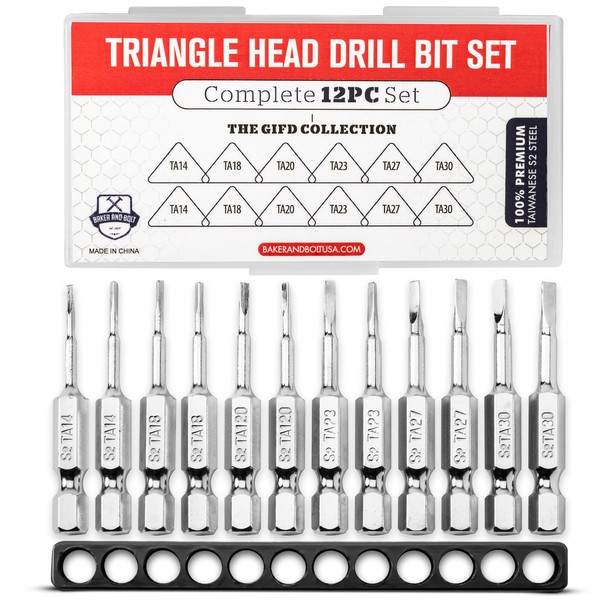 Triangle Drill Bit Set (Premium 12pc Complete Set) /w Storage Case and Bit Holder - TA14 - TA30 1/4in Hex Shank Magnetic Bit Set - The GIFD Collection - Fortified S2 Steel - Long 2in Heads for Drills