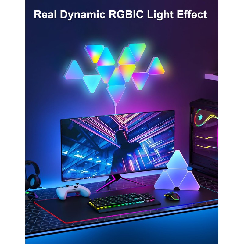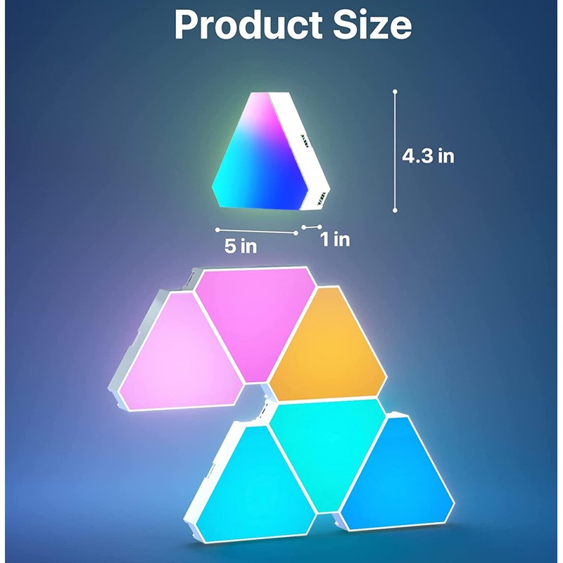 - 【UNLEASH CREATIVE LIGHT DESIGN】Dive into an ocean of 16 million colors and paint your space with unparalleled mood-enhancing illumination. With these triangle wall lights, create vibrant designs on your walls that reflect your unique personality and flair. From romantic nuances to party vibes, let your wall tell the tale. Unlike other gaming lights, our rgb lights for gaming room have 6 connection ports for MAX Customizability.Not just lighting but an artwork that showcases your unique essence
