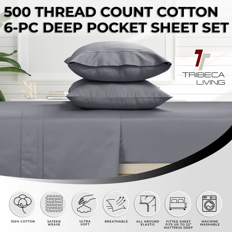 Tribeca Living King Bed Sheet Set, Soft Egyptian Cotton Sateen Solid Sheets and Pillowcase Set, Deep Pocket, 500 Thread Count, 6-Piece Luxury Bedding, Steel Grey