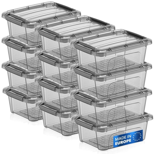 Tribello 12 Pack 1.25 Quart, Small Storage Container Bin With Lids, Mini Plastic Storage Container With Latching Lids For Organizing - Tinted - (8’ x 6” x 3”) - Made in EU