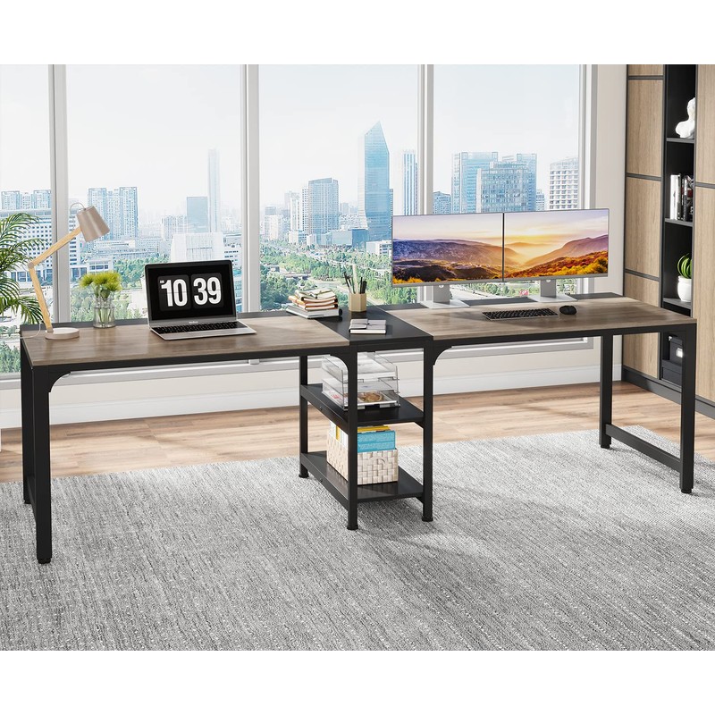 - 【Ample Work Area, Large Storage】: The double computer desk combines charming style and functional design, 90.55'' x 27.56'' tabletop provides the room you need for office essentials like your laptop, stacks of folders, and notepads. Attached with 2-tier storage shelves to put your printer, books, files, plants, and office supplies. Defining your space whatever you need.