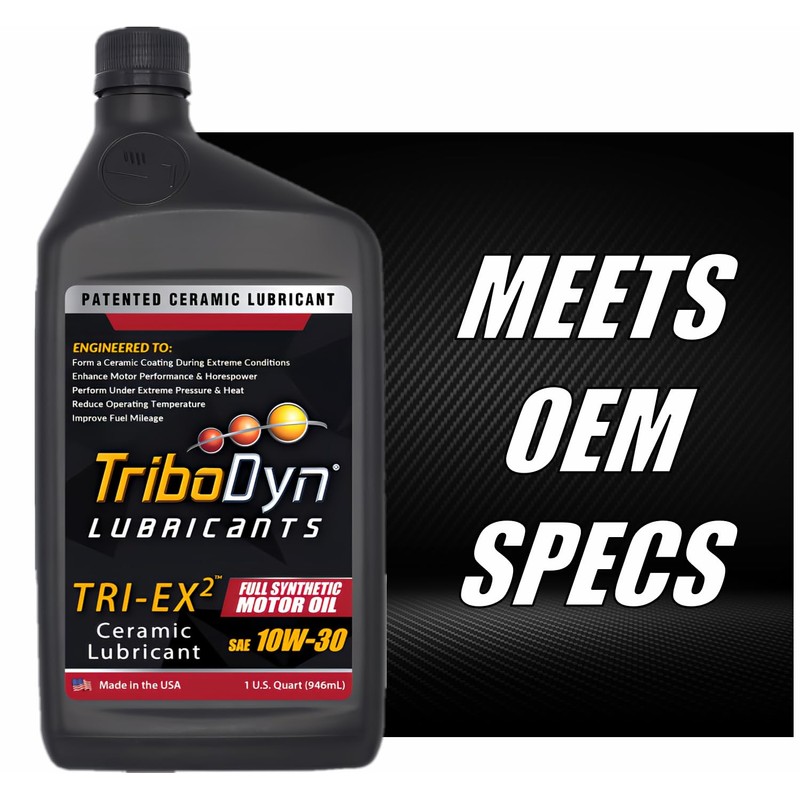 - TriboDyn TRI-EX2 10w30 Motor Oil combines advanced synthetic oil with cutting-edge ceramic coating technology for superior friction reduction, enhanced engine performance, and longer engine life.