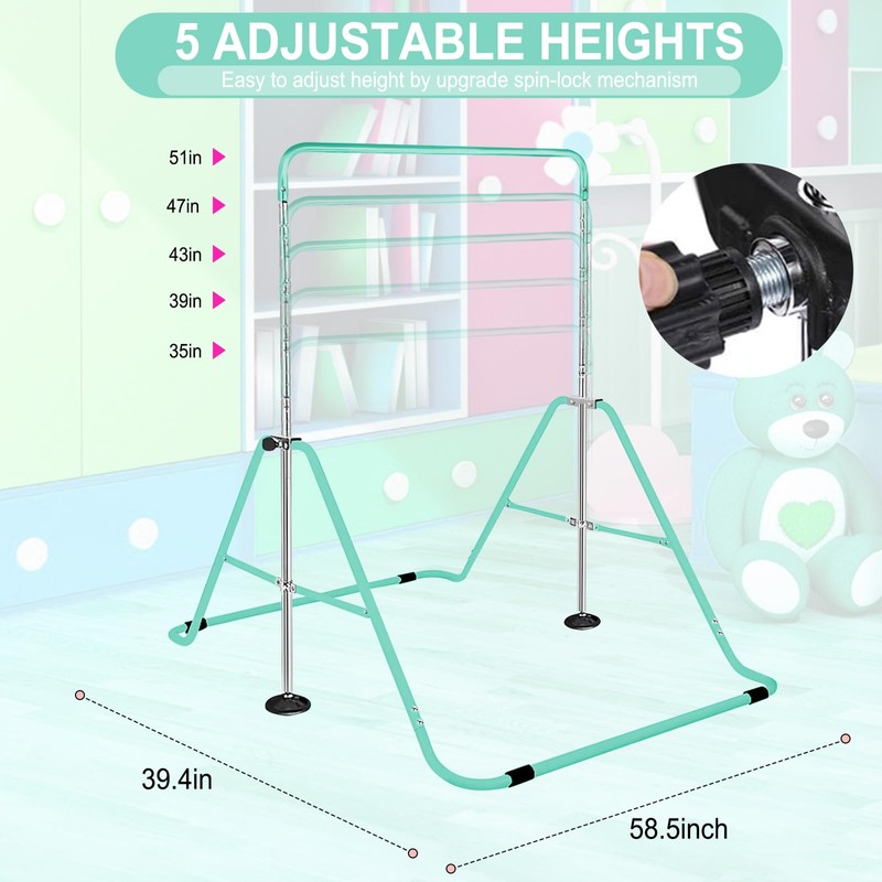 - 🔝 [ADJUSTABLE HEIGHT RANGE]: We understand that kids grow fast, which is why our gymnastics bar for home is adjustable. You can effortlessly adjust the height to 35", 39", 43", 47", or 51", making it suitable for kids between 3 - 12 years old. As your child develops and grows, the gymnastics kip bar can adapt to their changing needs, providing a consistent and safe training experience. This durable gymnastics equipment can be used for many years.