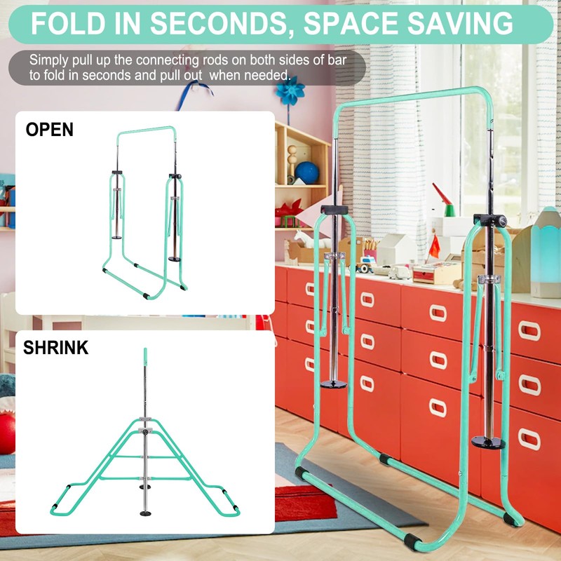 - 💪 [UNBEATABLE STRENGTH AND STABILITY: Our foldable gymnastics bar is built with a thick, galvanized steel tube frame that forms a rock - solid triangular structure. This design provides unparalleled stability, ensuring your child's safety during every gymnastic adventure. The four rubber rings on the legs of the home gymnastics bar add extra friction, while the two rounded pedestals on the support tube can be easily rotated to find the perfect balance on any surface.