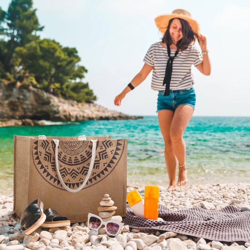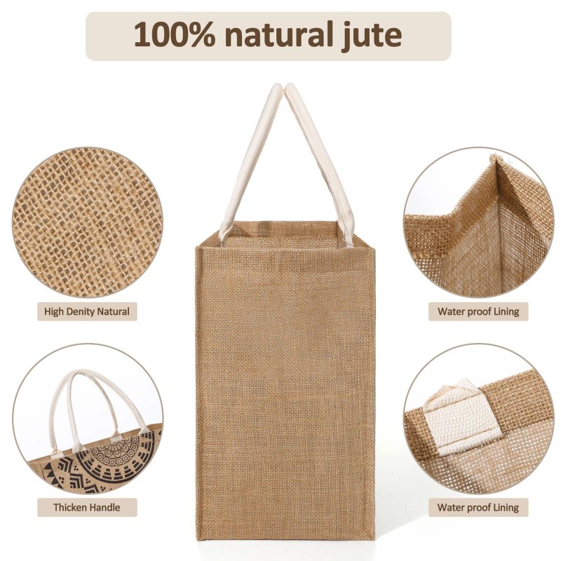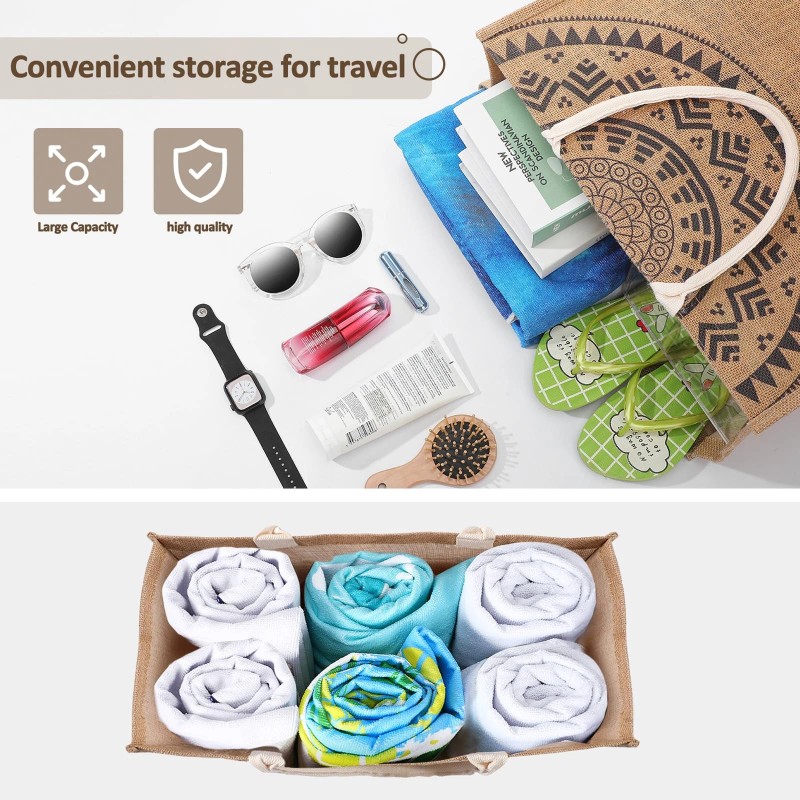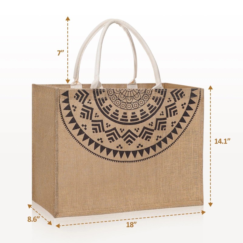 HIGH QUALITY - This beach tote bag is made of 100% natural jute fiber and you don't have to worry about safety. Laminated With a clear coating of PVC, it's waterproof. With high density and reinforced connection, this jute handbag is sturdy and not easy to break.