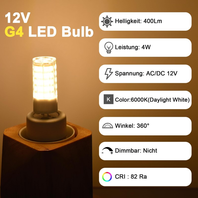 - 【Energy-saving】The G4 led bulb 4w is 400 lumens, bright enough to replace 30w-40w G4 halogen bulb, save 90 percent on electricity bill of lighting. This 12v LED bulbs need LED compatible transformer, not 120V input directly.
