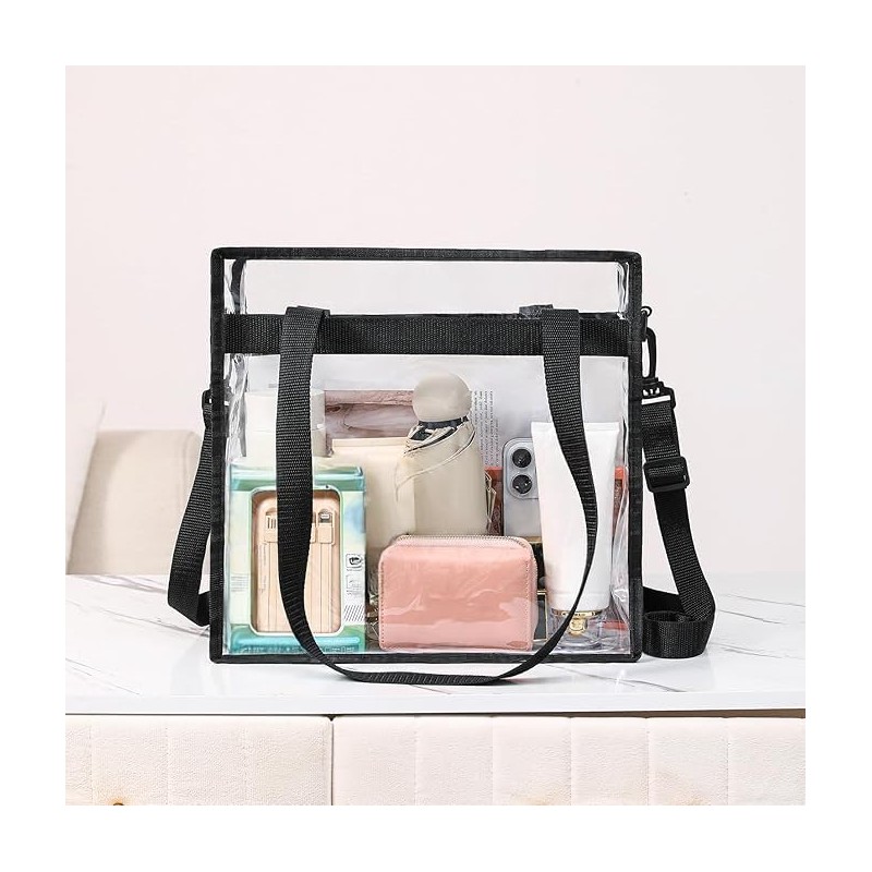 - MATERIAL DE CALIDAD: Fabricada con vinilo transparente de 0.3 mm de grosor y asas de nailon reforzadas con doble costura. Es resistente, no se rompe fácilmente y soporta el uso diario en actividades al aire libre o eventos concurridos.