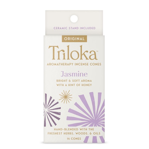 Triloka Jasmine Incense Cones: Harmonizing-Sensual. Bright & soft aroma with a hint of honey. Our cones are hand pressed and made with the freshest aromatic herbs, woods, flowers, & essential oils. Approximately 14 cones per box along with a small ceramic stand.