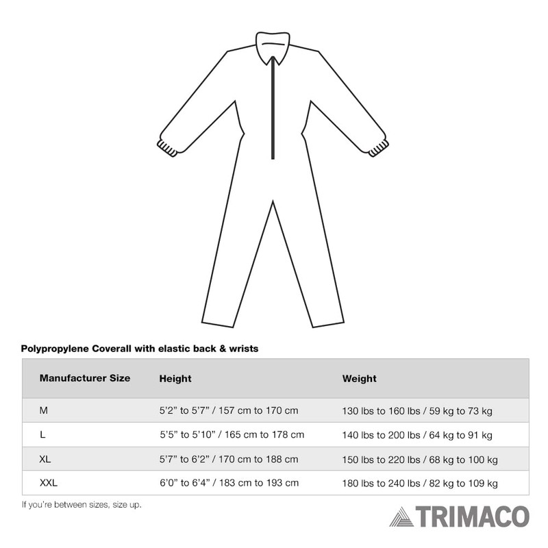 Trimaco's SuperTuff Polypropylene Disposable Coveralls are made from a special non-woven polypropylene fabric that protects skin and clothing from paint, grease, overspray and dirt. These coveralls are tough, durable, lightweight, tear-resistant, washable and resuable! Features a zippered front and elastic back and wrists. Legs can be cut to fit any height.