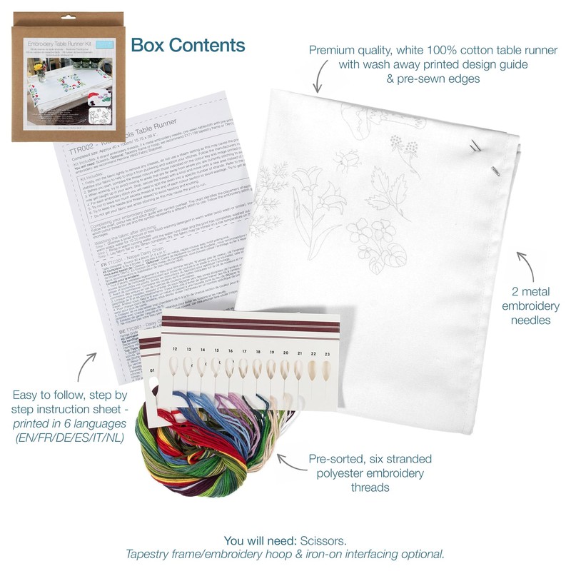 - This stitch your own embroidery kit includes everything you need; 6 stranded embroidery threads; 2x metal embroidery needles; pre-printed, premium quality cotton table runner and full colour instructions in 6 languages (EN/FR/DE/ES/IT/NL).