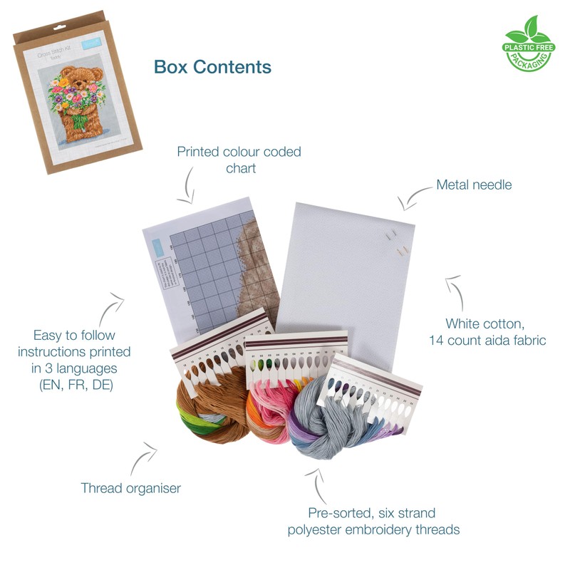 - Each kit includes: white 11 count cotton aida, 6 stranded polyester embroidery thread, needle and printed colour coded design and instructions.
