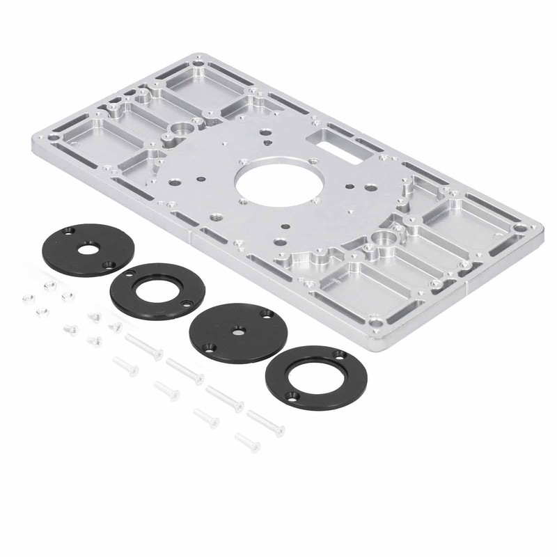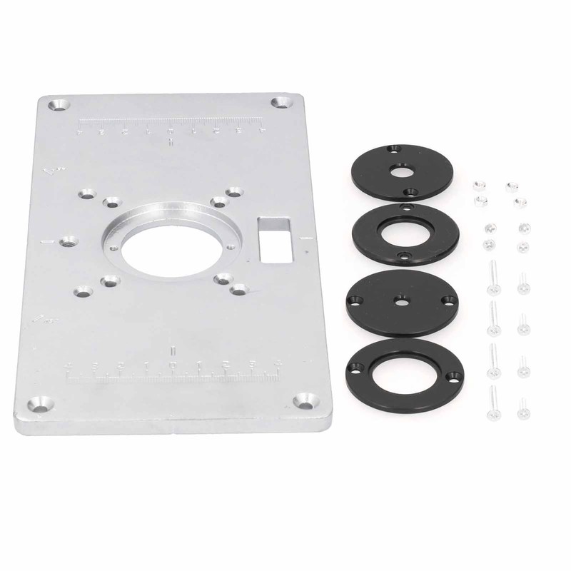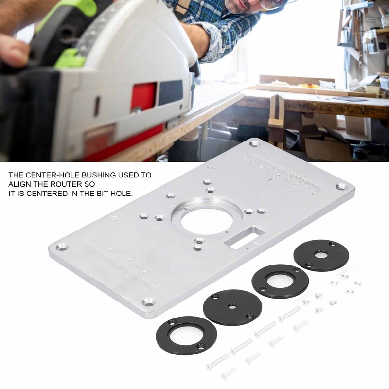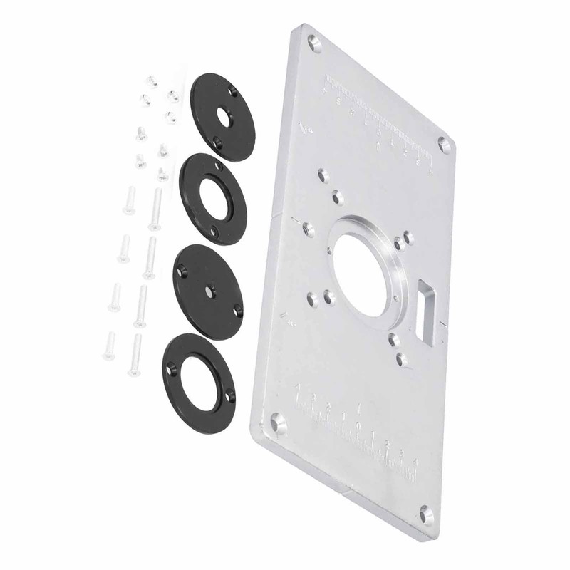 1、Using high‑quality aluminum alloy material, long service life, not easy to rust. 2、The center‑hole bushing used to align the router so it is centered in the bit hole. 3、Exquisitely manufactured, quality assurance, accurate scale and convenient operation. 4、Make accurately drilling and mounting any router easy, simple to use, make work be well done. 5、Woodworking router table insert plate kit, suitable for professional carpentry workbench.