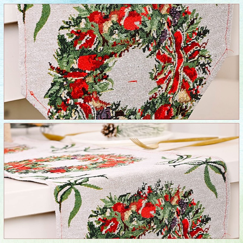 - 🎄🎅🏻⛄[PATTERN DESIGN]: This table runner is the perfect match for a Christmas-themed decoration. It features a vibrant Christmas wreath design woven with secure stitches for added durability. The edges are finished with a tassel, making it a striking addition to your holiday decor. The detailed craftsmanship is sure to impress your guests.