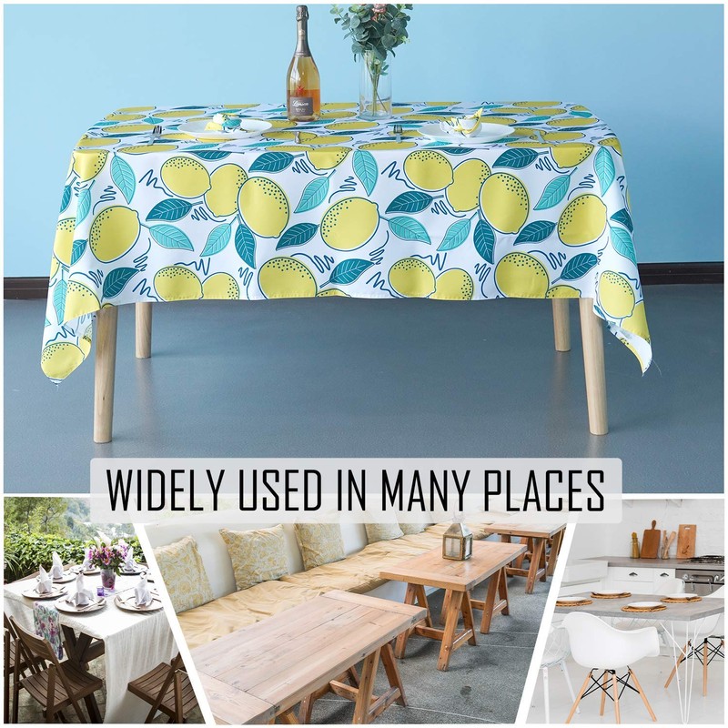 - đăPERFECT SIZEă: 60 x 84 inches (153 x 213cm) lemon-printed rectangle tablecloth is cut from a single piece of fabric to give a seamless look to your table with a lustrous drop. It is ideal for tables 5ft to 6ft in diameter, catering to a perfect space for 6 to 8 people. Perfect for kitchen tables, dining tables, tea or coffee tables, and garden patio tables