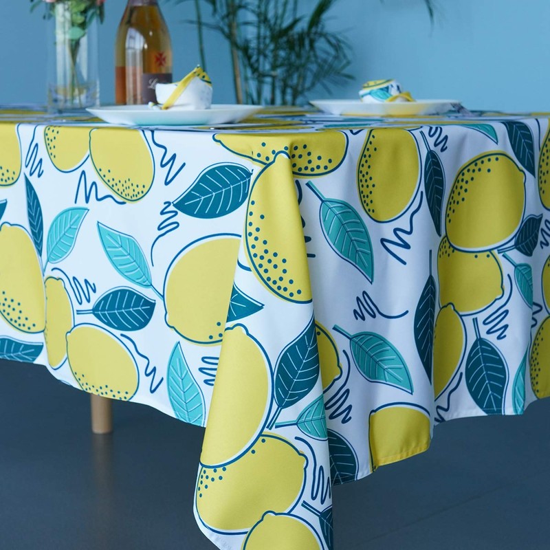 - đăPRINTED TABLECLOTHă: Add summer flair to your home decor with Trimming Shop's printed rectangle tablecloth. Printed summer tablecloth is designed with yellow lemon fruits and leaves creating a perfect spring-summer scene for indoor or outdoor table decor. It will add a touch of elegance to the summer party table setting and create a pleasant atmosphere
