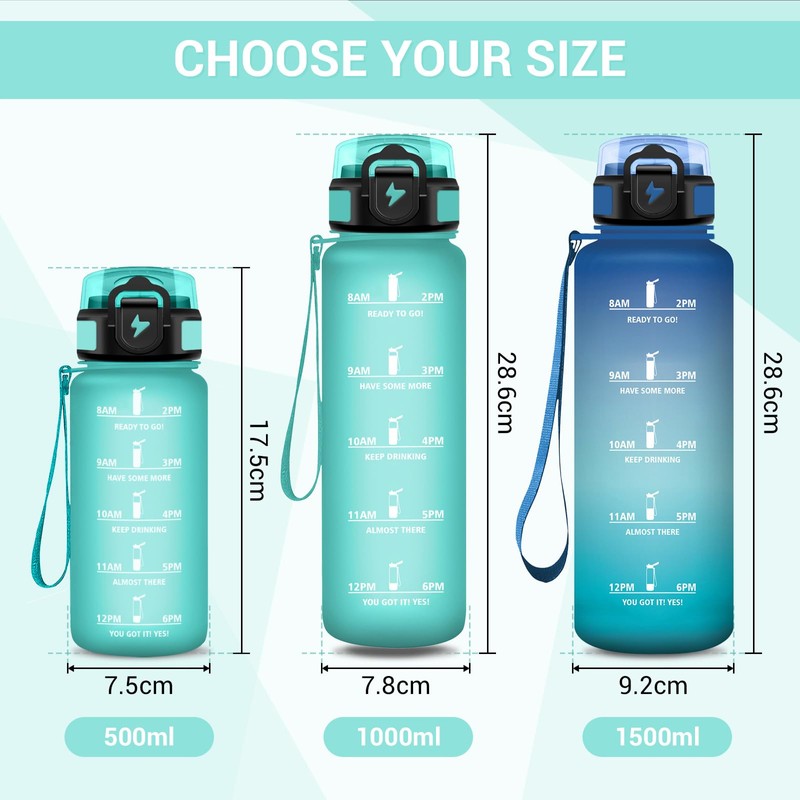 - ZEITMARKIERUNGEN: Diese motivierende Trinkflasche verfügt über gut lesbare Zeitmarkierungen und ansprechende motivierende Sprüche, die spielerisch erinnern, regelmäßig zu trinken. So wird es einfach, gesunde Trinkgewohnheiten zu entwickeln – der tägliche Wasserbedarf bleibt ganz selbstverständlich im Blick.