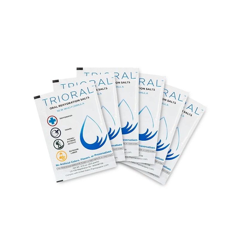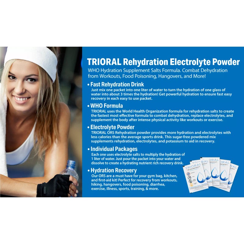 Each packet can be dissolved into one liter of drinking water to help re-hydrate your body quickly regardless of the reason.Product Uses:Dehydration may occur unexpectedly and rapidly as a result of excessive fluid loss due to sweating, urination, fever, diarrhea, vomiting, excessive physical activity and more. When the body is depleted of critical salts and water, severe dehydration many ensue, resulting in an acute medical emergency.Unlike many electrolyte solutions or other powders, this ORS does NOT contain any artificial sweeteners, flavoring agents, colors, or preservatives. TRIORAL ORS does NOT contain sucralose, aspartame, preservatives or any extra ingredients that may impact the quality and effectiveness. It is also gluten-free.