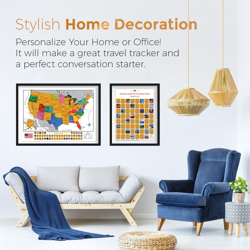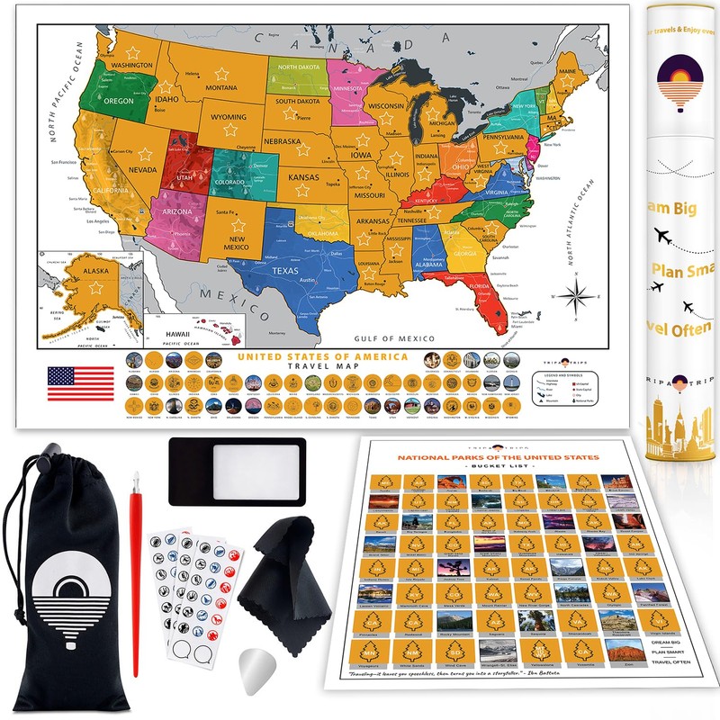 - EASY-TO-SCRATCH & FULL ACCESSORIES SET – Made to last a lifetime, our Scratch off Maps have the thickest laminated paper, which ensures an easy-to-scratch foil without damaging colours underneath. Be sure you'll get easy-to-use Travel Maps with perfectly overlapped, accurate & 2024 updated borders. Besides the USA Map Scratch off & National Park Poster, you'll also get a complete accessories kit: 2 x Scratchers, Magnifier, Wiping Cloth, 54 X Adventure Stickers & 1 Storage Pouch.
