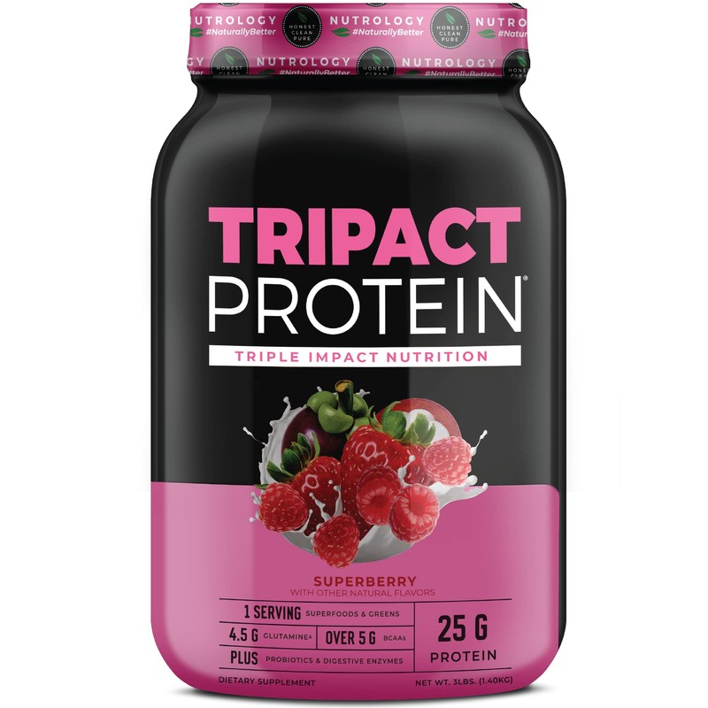 TRIPACT Protein - Premium Nutrition Shake - Non-GMO Grass Fed Whey Protein, Plant Proteins, Greens, Superfoods & Probiotics - Over 5g BCAAs - Superberry 3 lb.