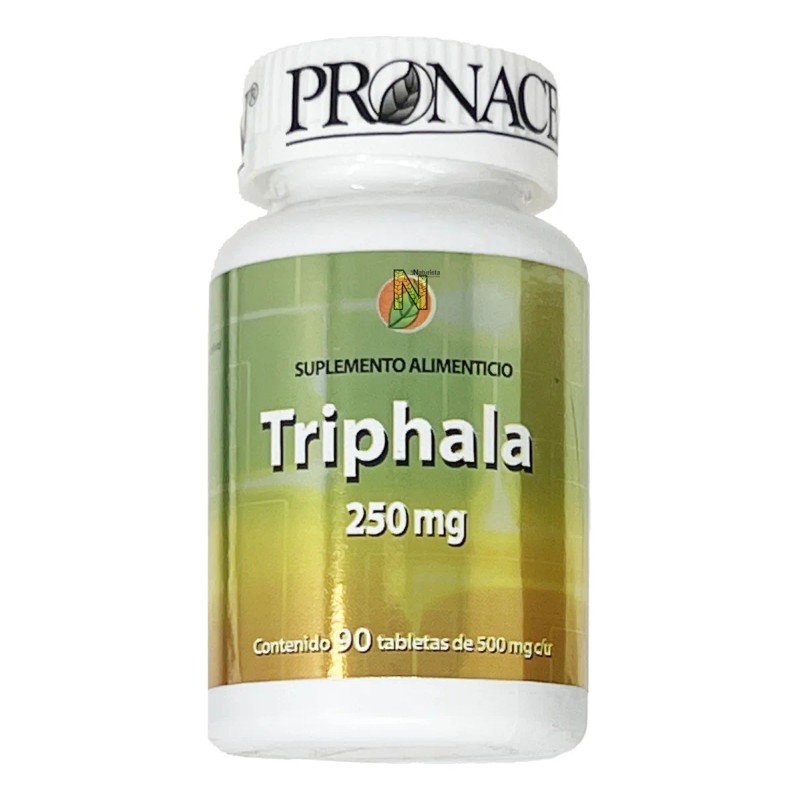 El Triphala de Pronacen es un suplemento en tabletas, presentado en un envase con 90 unidades, diseñado para apoyar la salud digestiva y promover el bienestar general, basado en principios ayurvédicos.