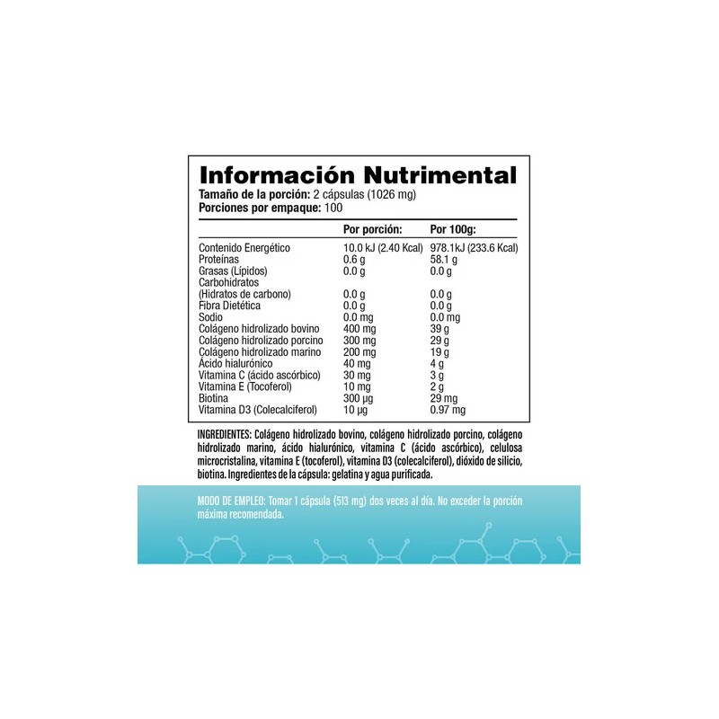 Triple colágeno (Marino, Porcino y Bovino) De Tipo 1, 2 Y 3 + Ácido Hialurónico y Biotina - Con vitamina C, D3 Y E - 200 Cápsulas - S&V - Sin Gluten y Sin OMG