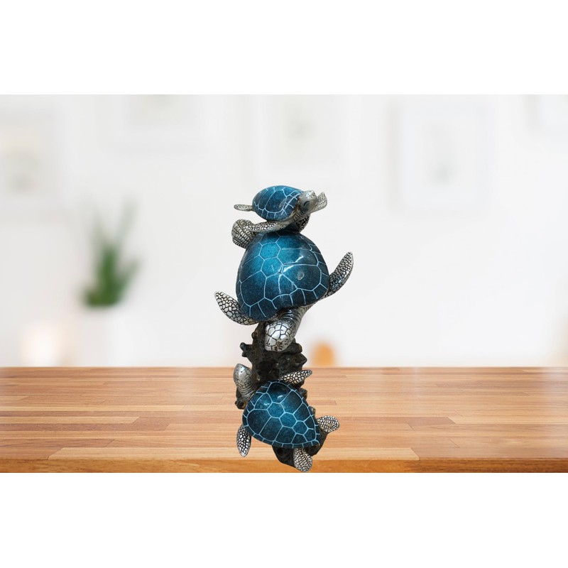 - Coral reef figurine features three sea turtles gracefully swimming on a coral base, crafted from polystone. The rich bronze, silver, and royal pacific blue hues make it a striking nautical decor piece. Its artistic design brings a dramatic and stylish coastal touch to any room.