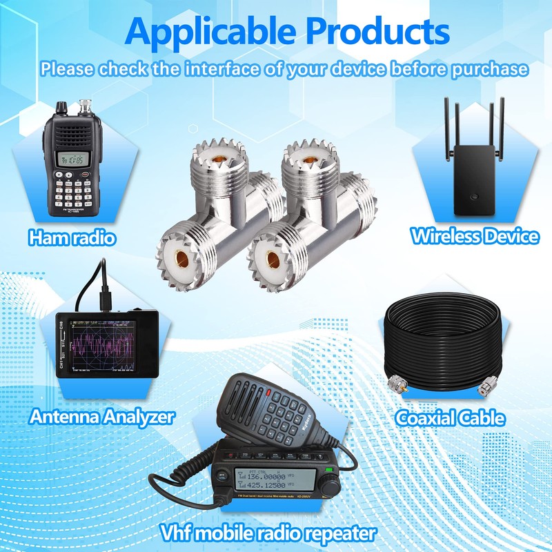 - Package Includes 2 pcs of UHF Female to dual UHF Female PL259 3 way adapter (connector 1:UHF Female, connector 2: UHF Female, connector 3: UHF Female )