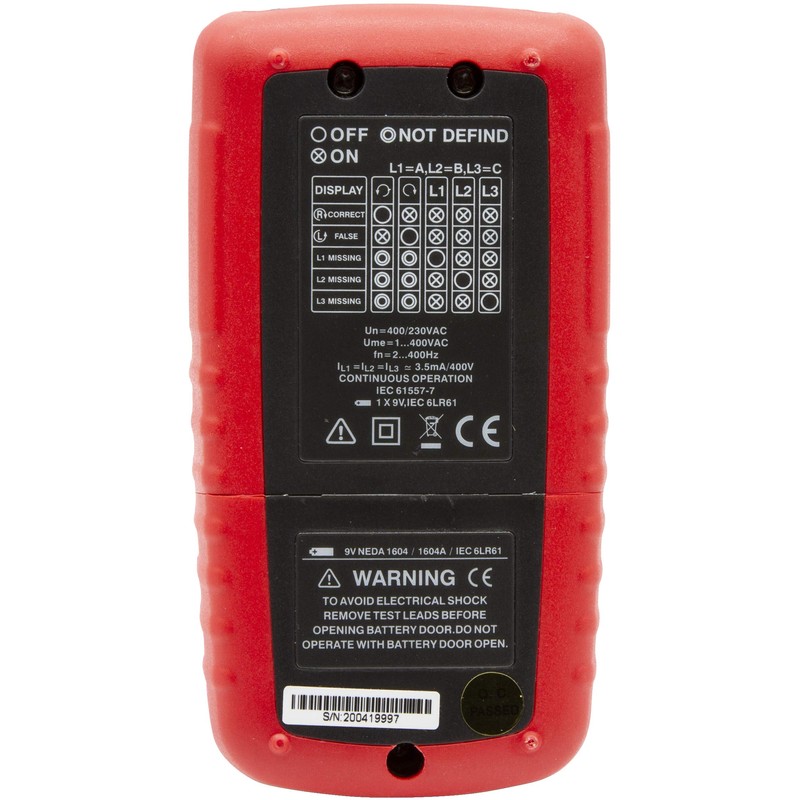 - leds display phase direction (clockwise/counter-clockwise) and which phases are live; includes 9v battery